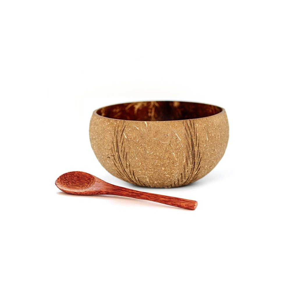 Pořiďte si ručně vyráběnou kokosovou misku ze skořápek kokosových ořechů se stylovým zdobením ve výhodném setu spolu s kokosovou lžící.