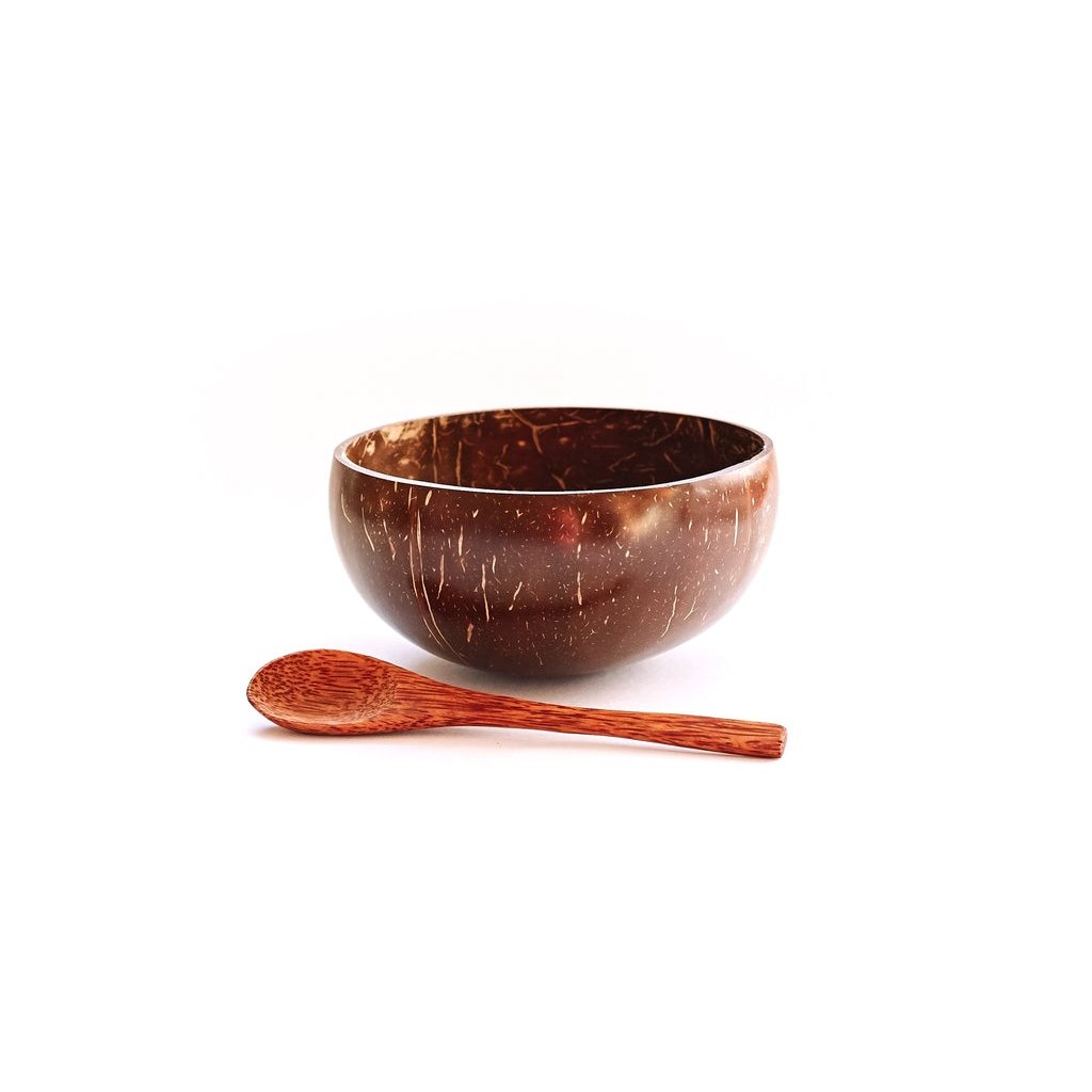 Pořiďte si ve výhodném setu ručně vyráběnou misku ze skořápek kokosových ořechů a kokosovou lžíci.