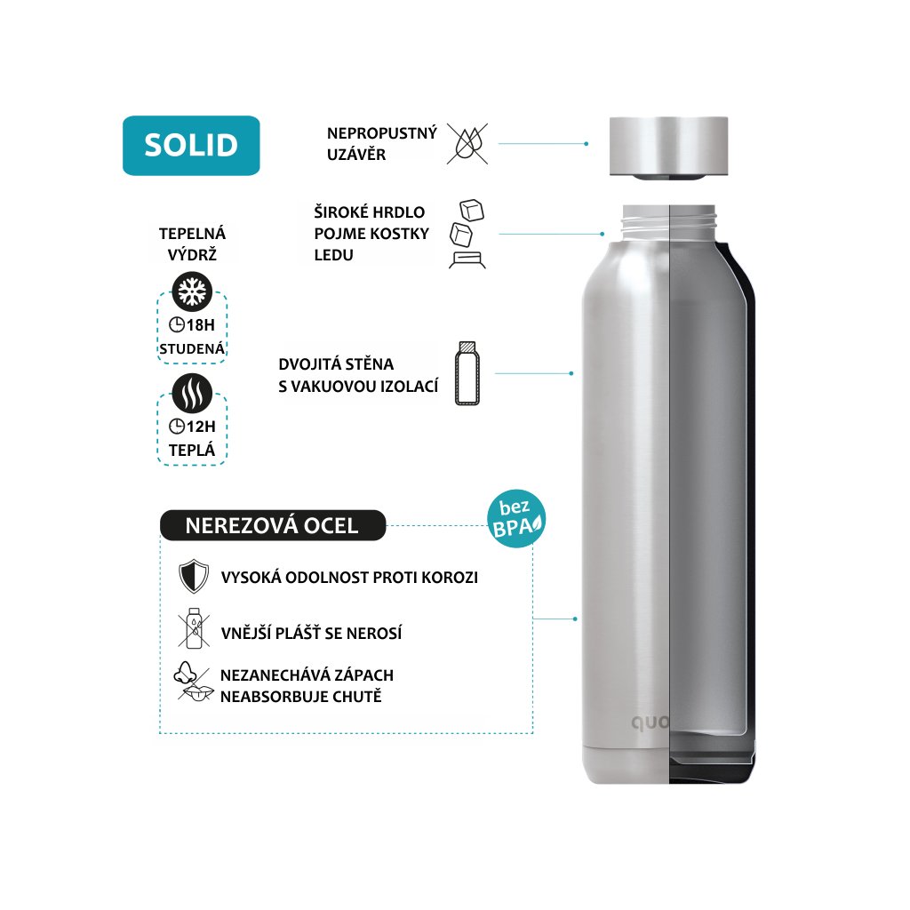 S termolahví Solid španělské značky Quokka zapomenete, že něco jako jednorázové lahve existuje! Je nejen stylová, ale taky 100% nepropustná a umí udržet nápoj teplý i vychlazený na dlouhé hodiny.