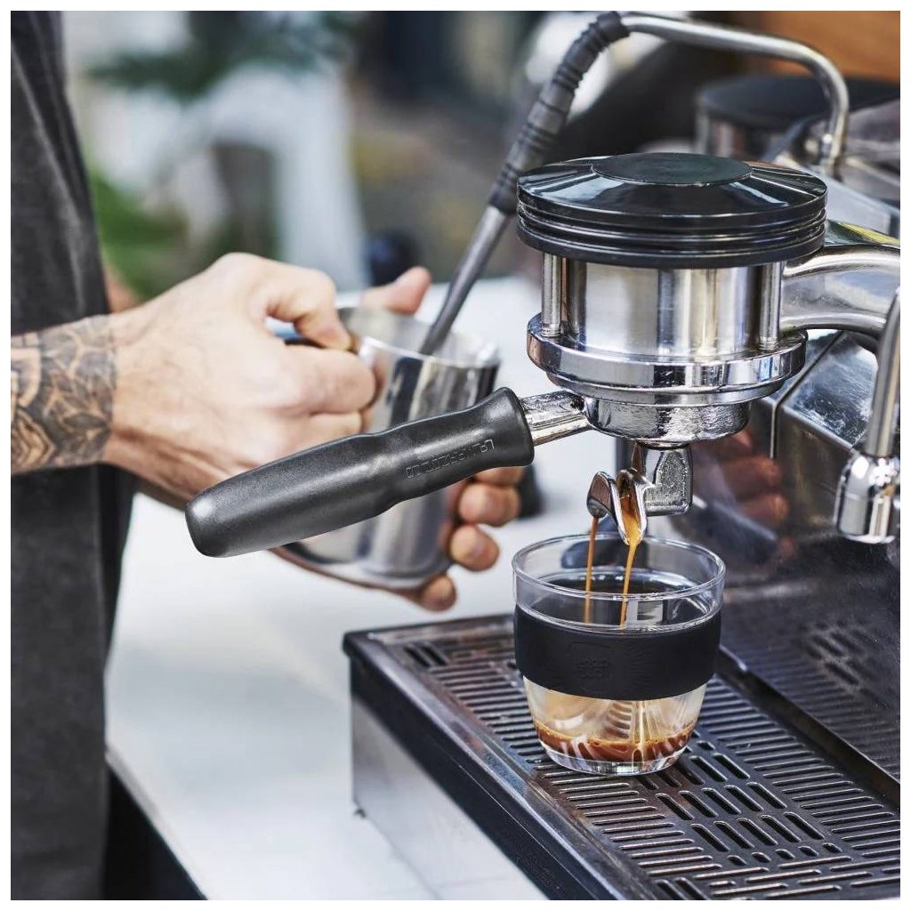 Je vyrobený z odolného tvrzeného skla, které je připravené na vysoké teploty. Okolo hrnku je tepělně odolný silikonový pásek pro příjemné a bezpečné uchopení. Víčko zabraňuje vylití tekutin při napití nebo přenosu a jeho součástí je praktické zavírání (i tak jej ale udržujte ve vertikální poloze – do kabelky nebo batohu se nehodí). Velikost S je přesně tak akorát na flat white nebo espresso.