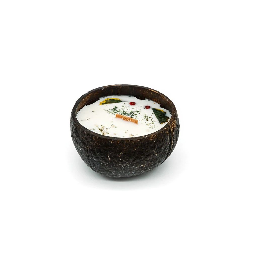 Složení: kokosová miska, 100% přírodní sójový vosk, dřevěný knot, 100% esenciální a vonné oleje, ruční zdobení sušenými květy a bylinkami