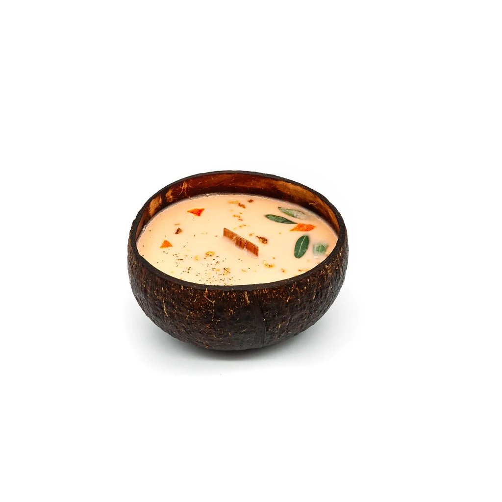 Složení: kokosová miska, 100% přírodní sójový vosk, dřevěný knot, 100% esenciální a vonné oleje, ruční zdobení sušenými květy a bylinkami